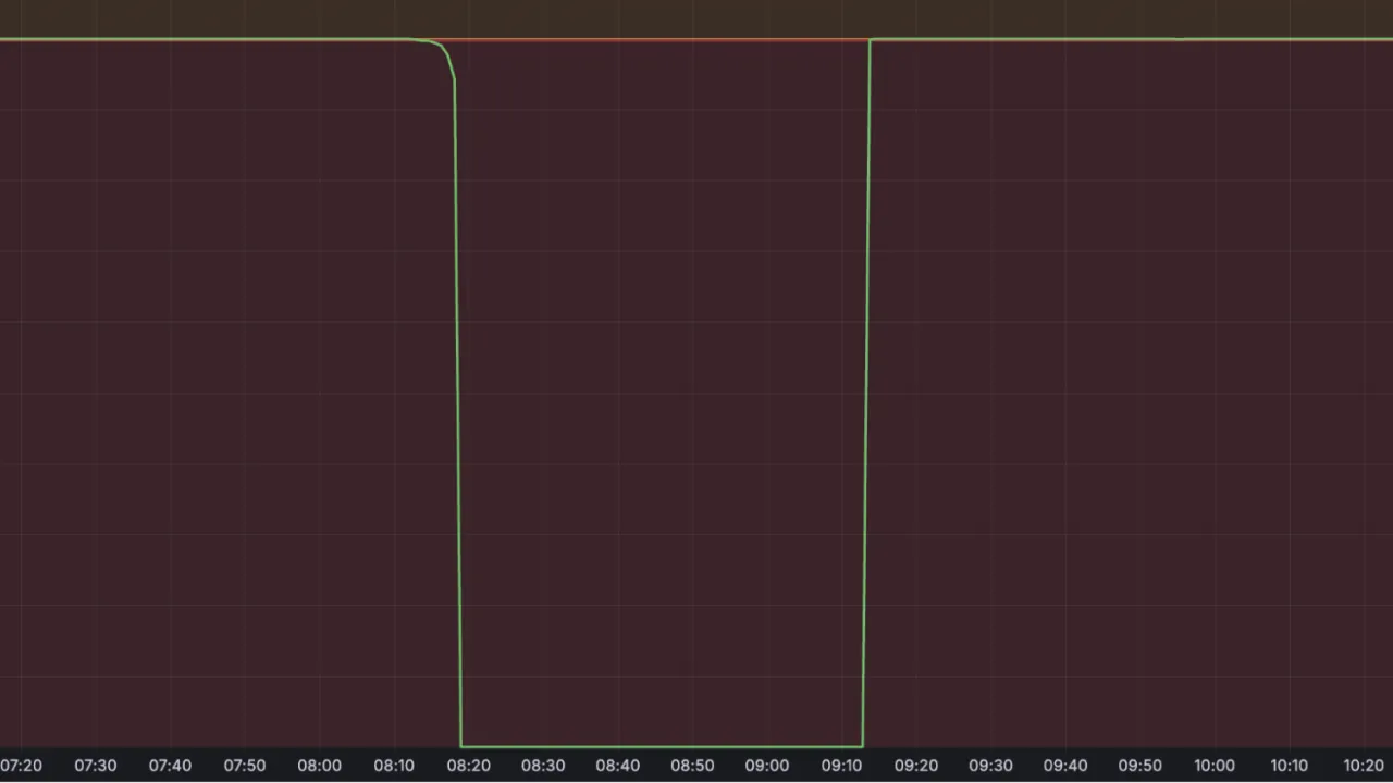 در سطح خدمات R2، معیارهای داخلی «Prometheus» ما نشان داد که «SLO R2» تقریباً بلافاصله به صفر درصد کاهش یافت، زیرا سرویس Gatewayخدمترسانی را متوقف کرد و درخواستهای حین پرواز را خاتمه داد.