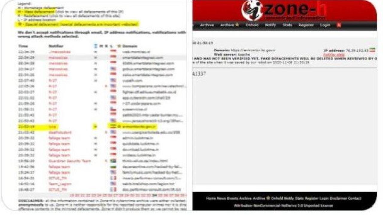 اخیراً نیز در دو روز گذشته شاهد بروز حمله سایبری دیگر، این بار در زیرمجموعه خود وزارت ارتباطات بودهایم. بنابر گزارشهای دریافتی از سایت (zone-h) (که سایت معتبر جهانی بهمنظور معرفی رده هکرها است)، سایت رصد و پایش دولت الکترونیکی به نشانی (e-monitor.ito.gov.ir) توسط یک تیم هکری مورد هک قرارگرفته است.